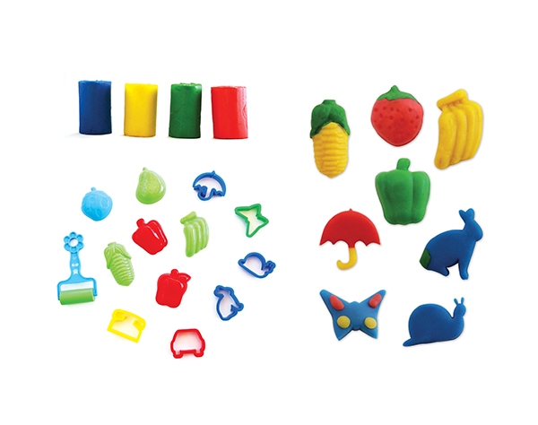 Includes 4 different brightly colored, high quality, environmentally friendly modeling doughs*, 12 dough cutters and 1 roller.