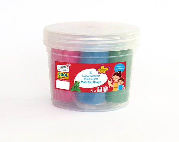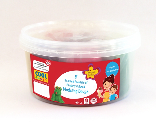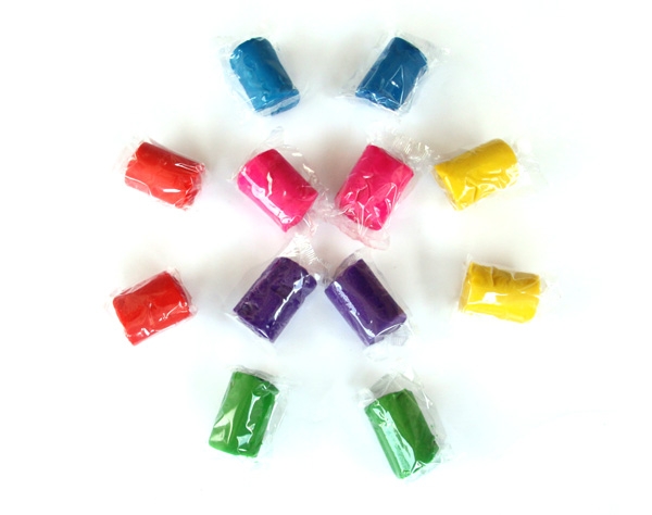 Contains 12 individually wrapped, scented packlets of brightly colored, reusable, designer modeling dough in a transparent bulk container.