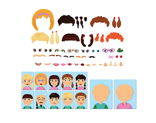 53 colorful magnetic face pieces, 10 two-sided sample face cards and 2 magnetic work face cards.